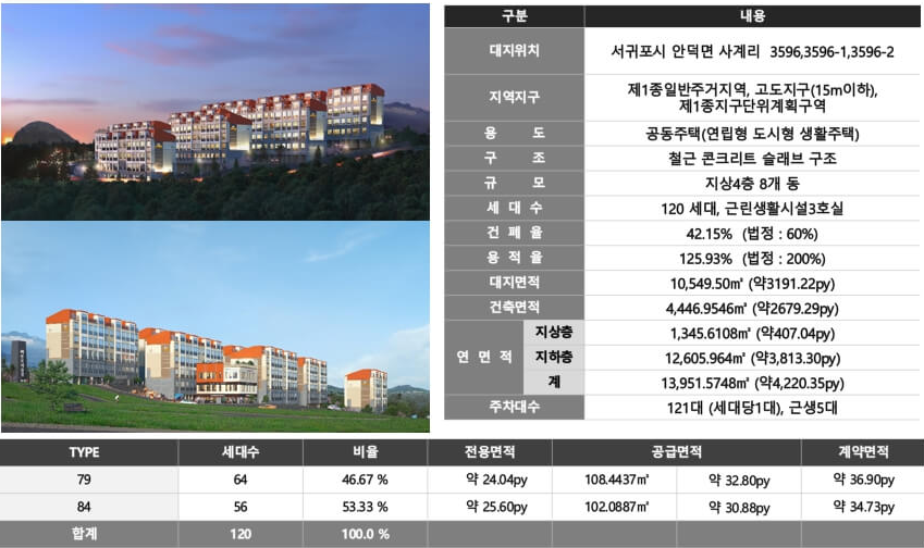 서귀포 오션캐슬은 총 8개 동의 4층 건물로 구성되어 있으며, 총 120세대를 수용합니다. 주차 공간도 세대당 1대씩 총 121대로 설계되어 있어 편리한 주차 환경을 제공합니다.