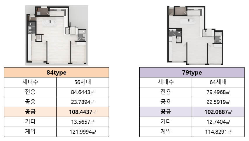 오션캐슬은 79㎡와 84㎡ 두 가지 타입으로 구성되어 있으며, 각 타입별 다양한 설계 구조를 제공합니다.