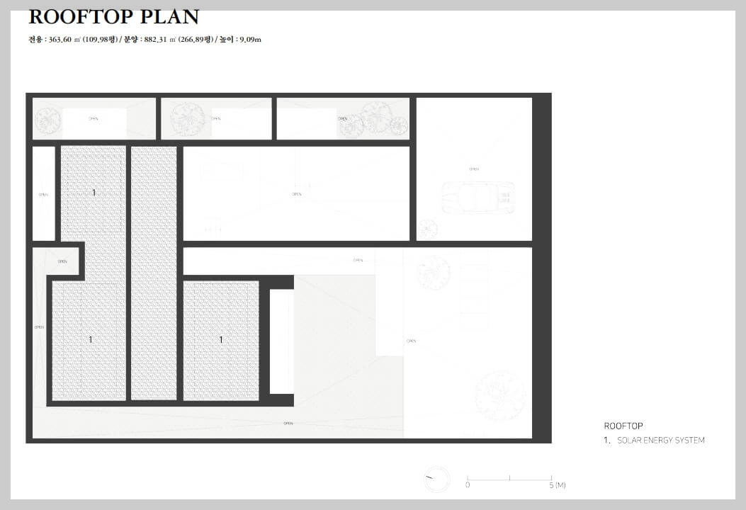 1층에는 주방, 거실, 침실 등이 있으며, 중정가든과 연못을 조망할 수 있는 공간이 마련되어 있습니다. 2층은 갤러리라운지와 마스터룸, 테라스 등으로 구성되어 있으며, 옥상에는 수영장이 마련되어 있어 휴식을 취할 수 있는 공간입니다.