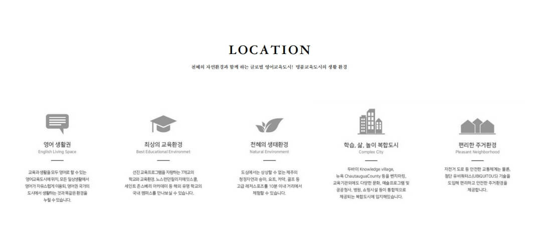 최고의 학교 및 쇼핑, 의료시설 인프라가 풍부합니다. 대표적으로 20분 거리 내에 서귀포 혁신도시와 첨단의료 복합단지인 헬스케어타운이 근접해 있습니다. 4개의 국제학교가 운영 중인 영어교육도시와 차량 10분 내 거리로 뛰어난 접근성!!