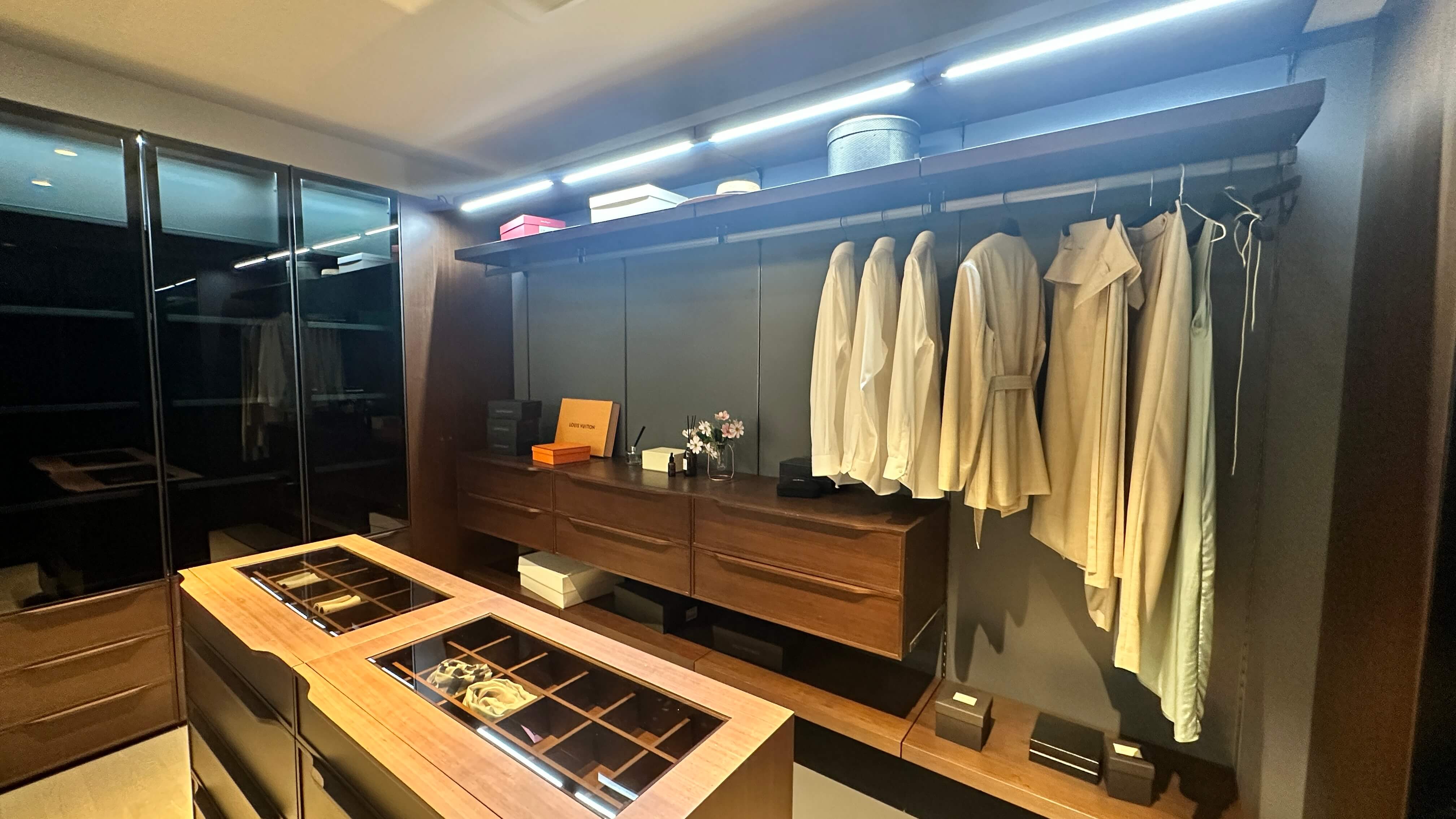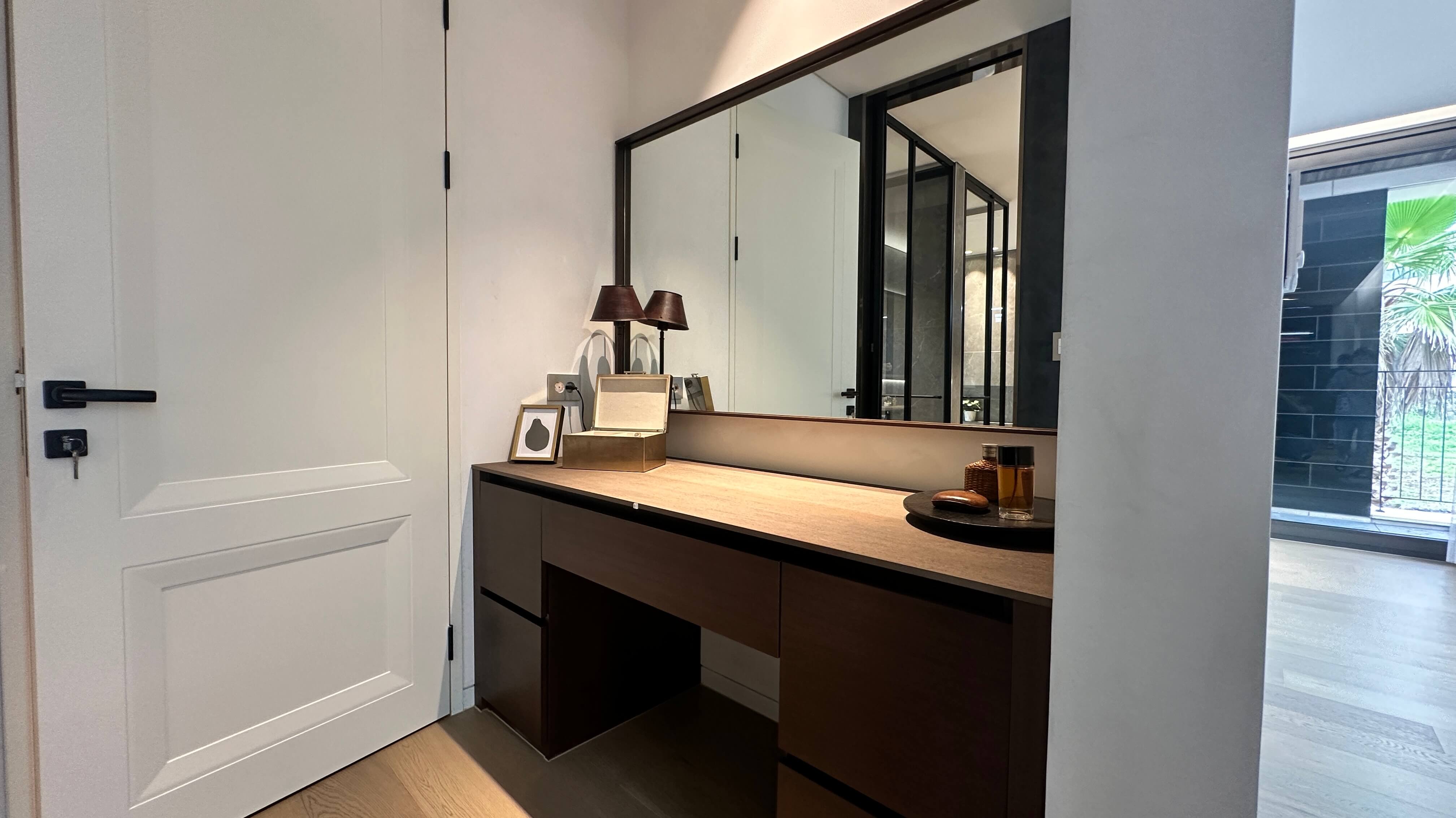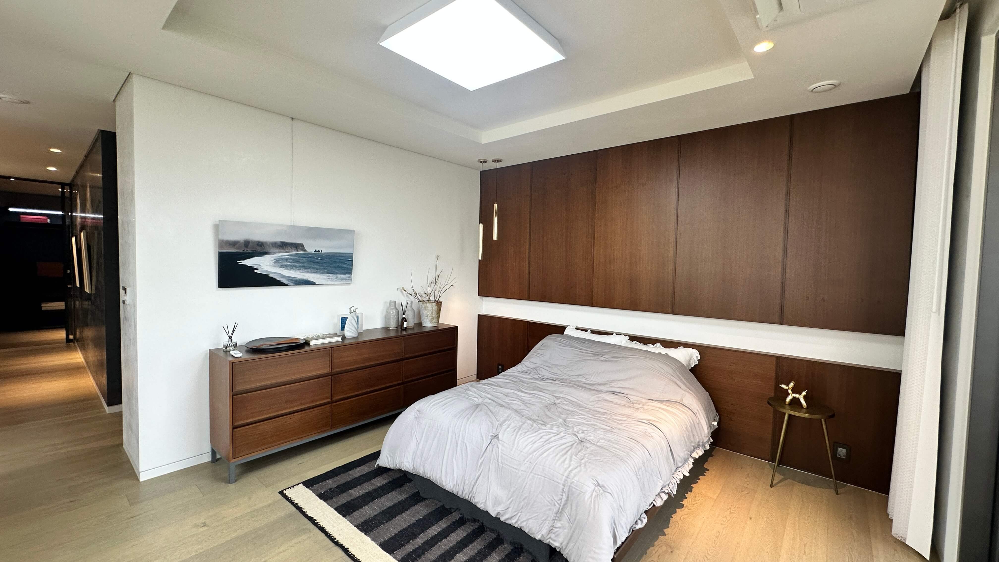 마스터룸은 파우더룸, 드레스룸, 전용 욕실, 그리고 테라스를 포함한 넓은 구성으로 설계되었습니다. 동선은 사각형 형태로 짜여져 있어 편리하고, 드레스룸은 북미산 월넛 무늬목과 헤펠레 조명을 사용해 우아함을 더했습니다.