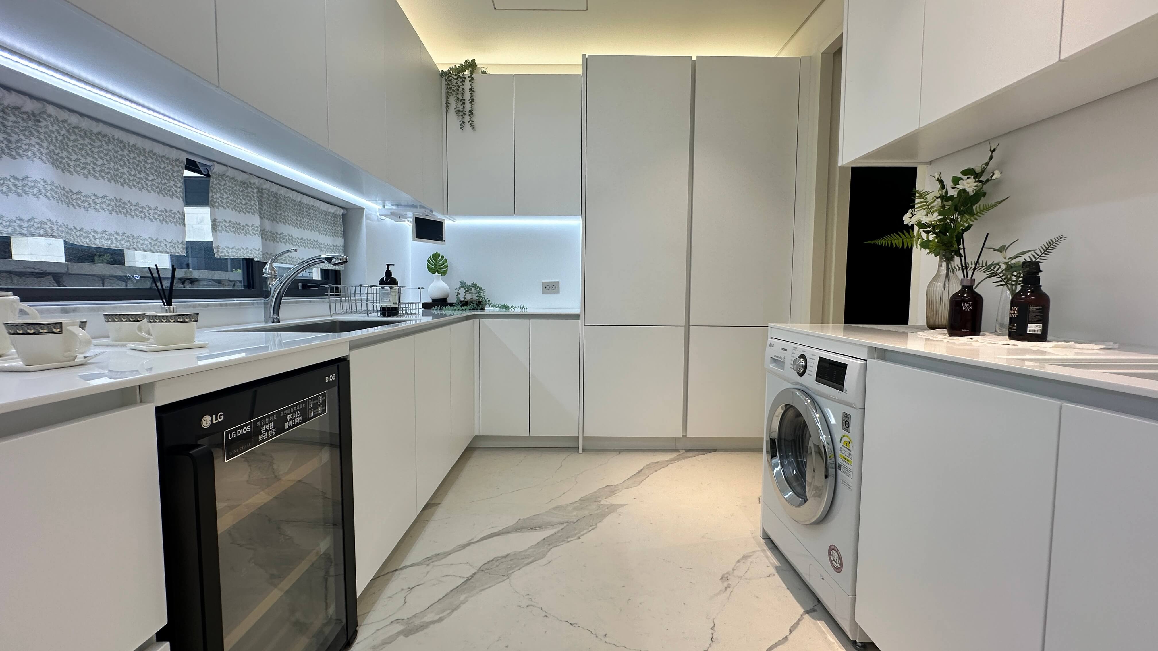 화이트톤 인조대리석 마감으로 구성된 보조주방에는 넉넉한 수납 공간과 LG 트롬 드럼세탁기 등이 빌트인으로 설치되어 있어 실용성을 더했습니다.