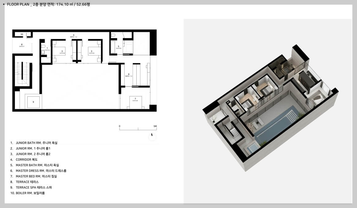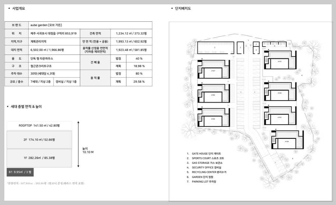 규모: 지하 1층(기계실) ~ 지상 2층, 총 7세대 / 경비동 1동 / 스포츠코트 1동