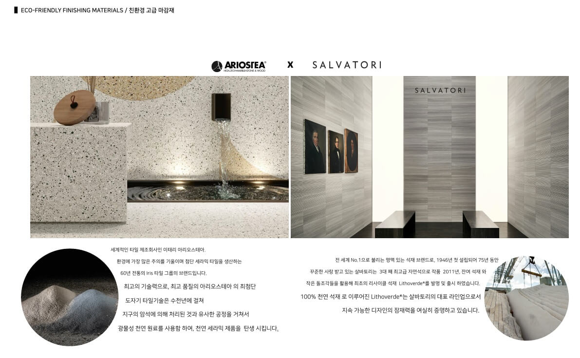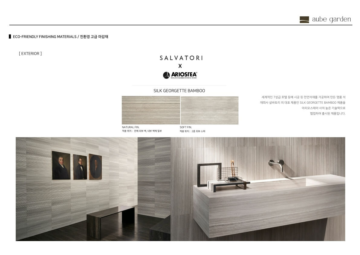 오브가든은 외장재로 전 세계 No.1 석재 브랜드인 살바토리를 사용하여 웅장한 외관을 자랑합니다. 살바토리는 1946년 설립되어 3대째 이어져 내려오는 최고급 자연석 브랜드로, 전 세계적으로 인정받고 있습니다.