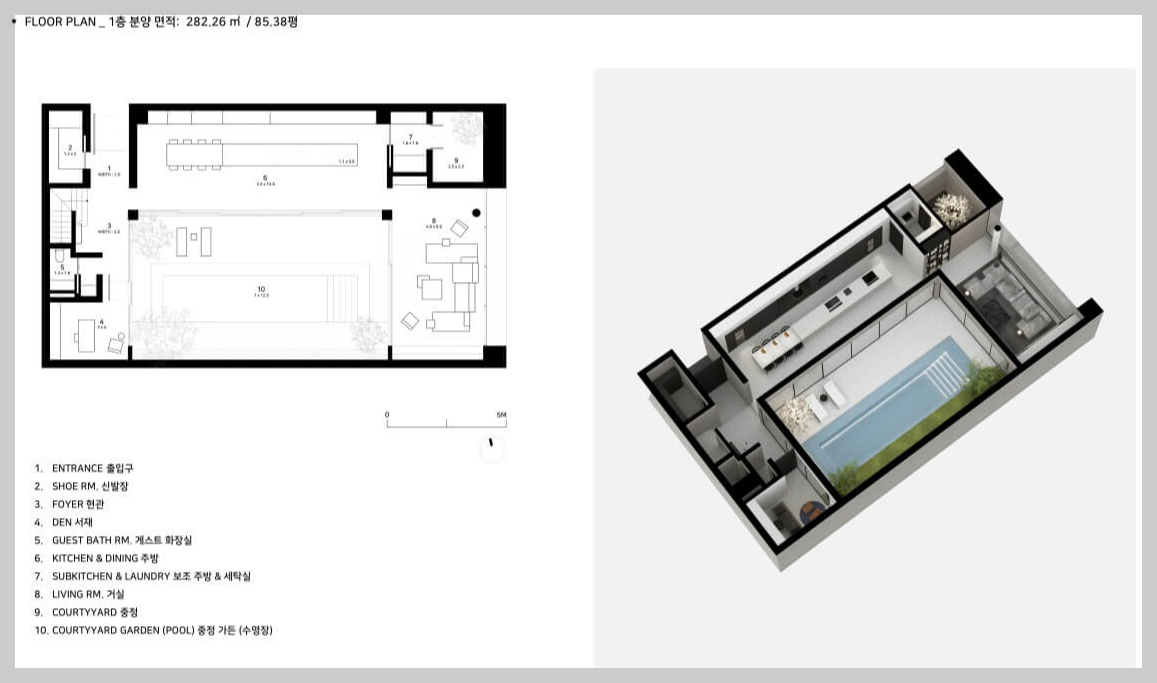 오브가든의 1층 면적은 282.26㎡ (85.38평)으로, 내부는 중정 가든을 중심으로 주방, 다이닝룸, 거실, 서재의 주요 공간이 서로 연결되어 있습니다. 2층 면적은 174.10㎡ (52.66평)으로, 마스터존과 주니어존으로 나뉘며 침실 3개와 욕실 2개, 테라스 스파로 구성되어 있습니다.