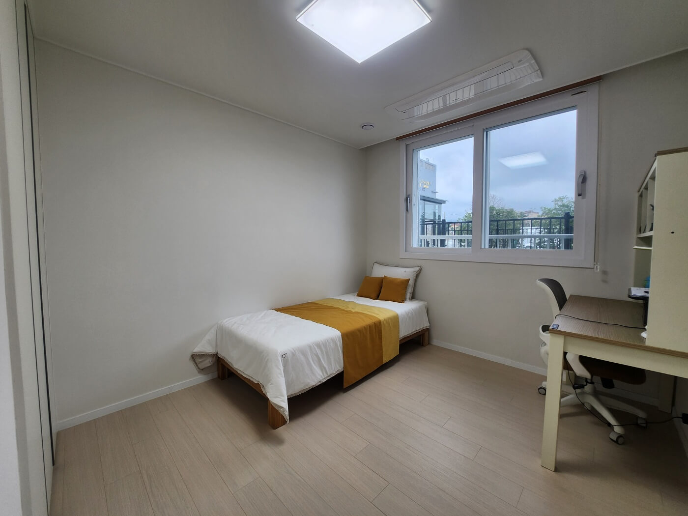 제주트라움의 4층 복층은 층고가 1.8m 이상으로 설계되어 있어, 성인 남성도 불편함 없이 생활할 수 있습니다. 삼각형 꼭지점을 제외한 모든 공간이 실용적으로 활용 가능하며, 넓은 계단이 복층과 연결되어 편리하게 이용할 수 있습니다.