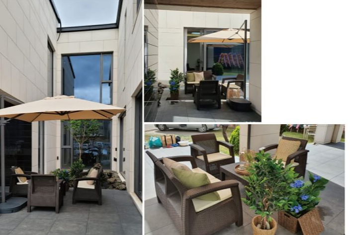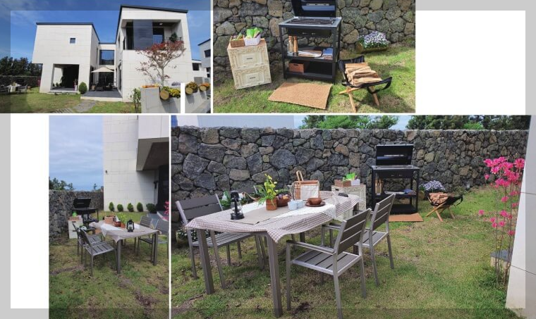 외관은 밝고 산뜻한 라임스톤으로 시공되었으며, 관리가 용이하고 깔끔한 인상을 줍니다. 각 주택에는 중정이 있어 안정감을 더하며, 단열과 기밀성이 뛰어난 유럽산 스윙도어가 설치되어 있습니다. 현관문은 지문 인식과 스마트폰 개폐 시스템을 지원하여 편리함과 보안을 동시에 제공합니다.