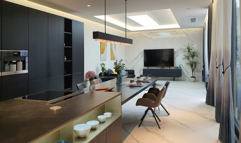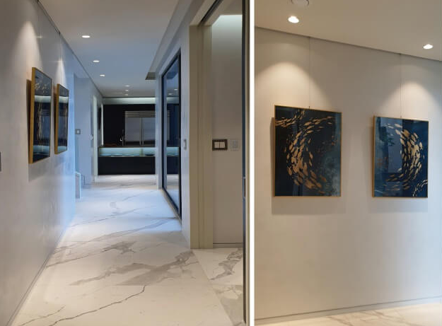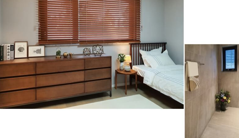 거실은 통창을 통해 중정뷰를 바라보며, 우물천장이 포함된 2.9m의 높은 천장은 개방감을 극대화합니다. 바닥은 비앙코카라라 천연대리석으로 마감되었고, 벽은 이탈리아산 1m x 3m 사이즈의 세라믹 타일을 사용해 고급스럽고 깔끔한 분위기를 자아냅니다. 또한, 창호는 3중 Low-E 시스템 이건창호를 사용하여 방음과 단열, 습기 방지에 탁월한 성능을 자랑합니다.
