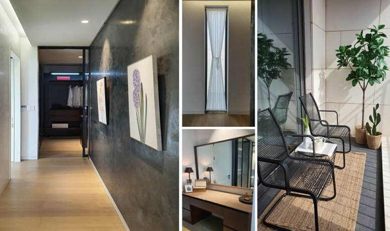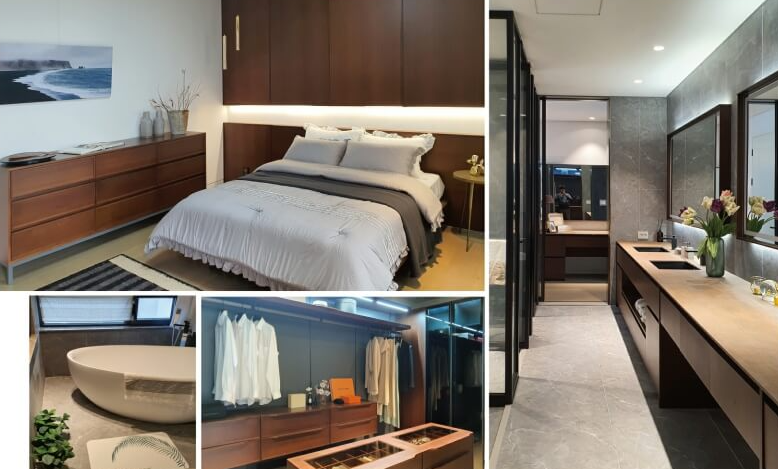 마스터룸은 파우더룸, 팬트리, 드레스룸이 연결된 동선으로 되어 있어 효율적인 생활이 가능합니다. 침실에서 파우더룸, 욕실, 드레스룸으로 이어지는 동선은 마치 5성급 호텔과 같은 고급스러움을 선사합니다.