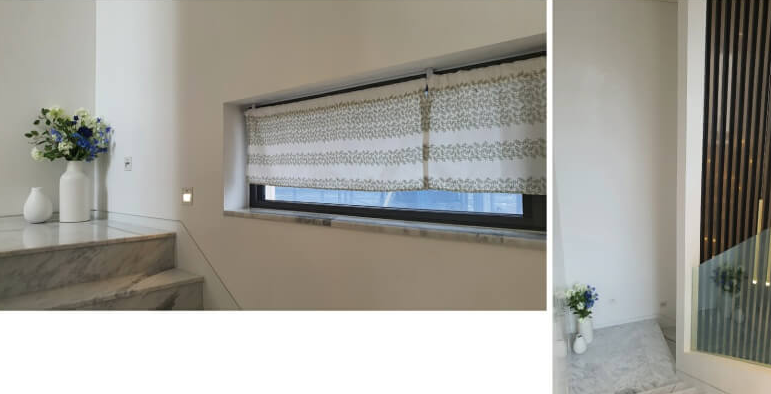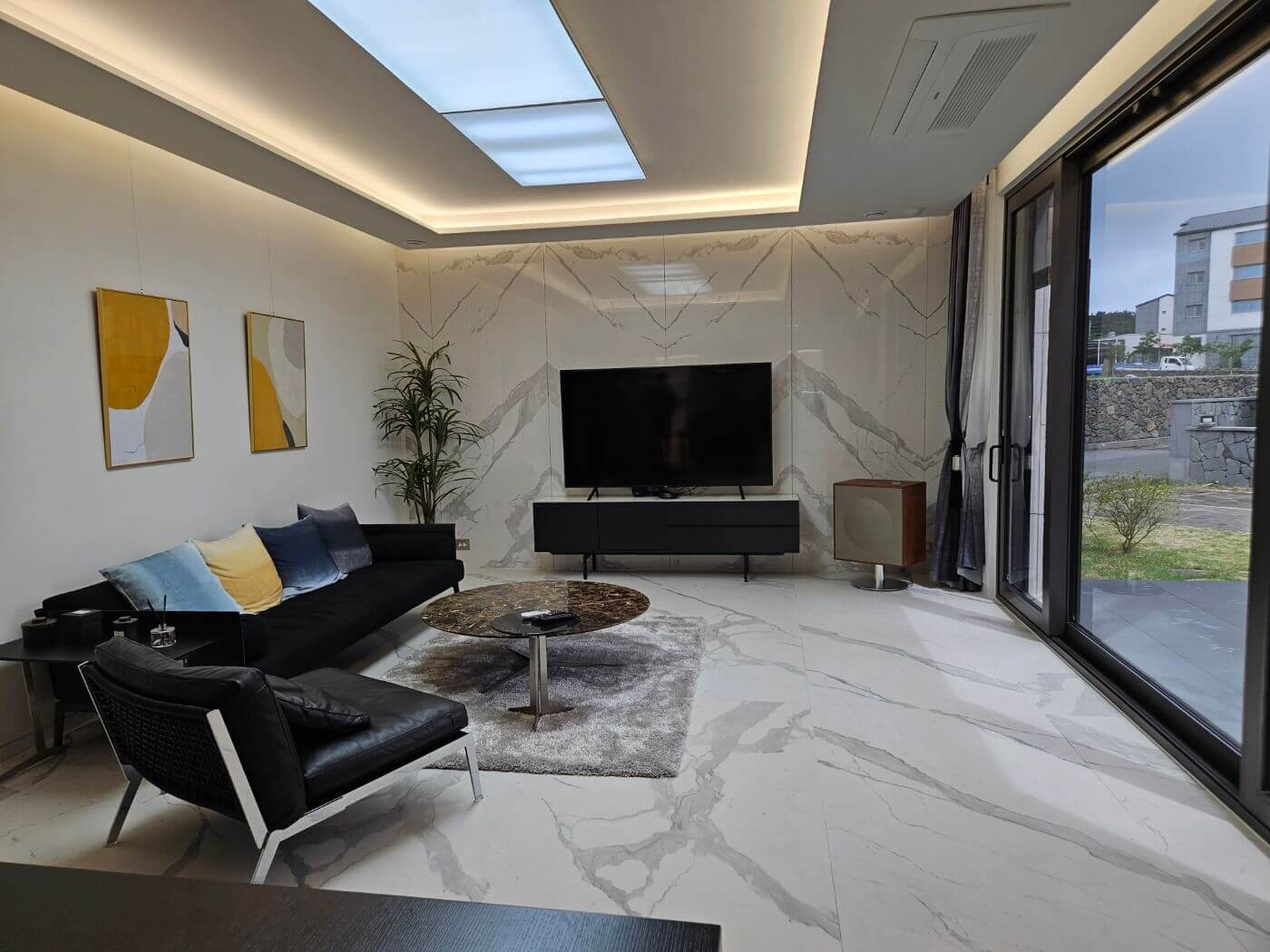 거실은 통창을 통해 중정뷰를 바라보며, 우물천장이 포함된 2.9m의 높은 천장은 개방감을 극대화합니다. 바닥은 비앙코카라라 천연대리석으로 마감되었고, 벽은 이탈리아산 1m x 3m 사이즈의 세라믹 타일을 사용해 고급스럽고 깔끔한 분위기를 자아냅니다. 또한, 창호는 3중 Low-E 시스템 이건창호를 사용하여 방음과 단열, 습기 방지에 탁월한 성능을 자랑합니다.