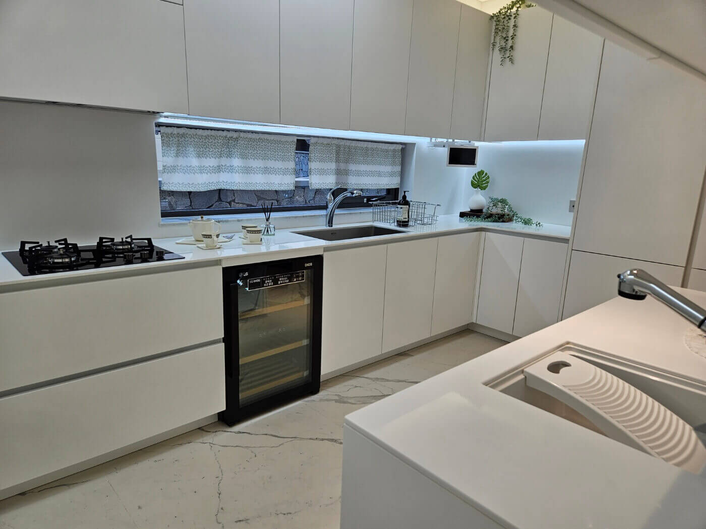 보조주방은 화이트톤의 깔끔한 디자인으로 마감되었으며, LG 트롬 드럼 세탁기와 김치냉장고, 와인셀러가 빌트인 되어 있어 다양한 가전 제품을 쉽게 사용할 수 있습니다. 넉넉한 수납공간과 함께 효율적인 동선이 돋보입니다.