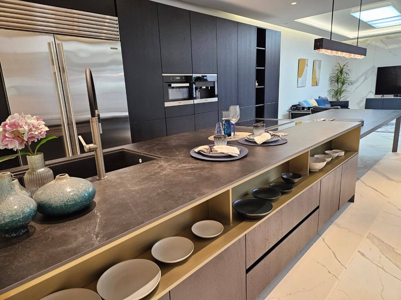 주방은 하이엔드 가전제품이 풀옵션으로 제공됩니다. 서브제로 냉장고, 밀레 오븐, 커피 메이커, 인덕션, 식기세척기 등이 설치되어 있으며, 팔맥의 다운드래프트 후드가 장착되어 실용성과 스타일을 모두 충족합니다. 북유럽 노르웨이 오크 무늬목으로 제작된 도어와 이탈리아 Inalco 세라믹 상판은 주방의 품격을 한층 높여줍니다.
