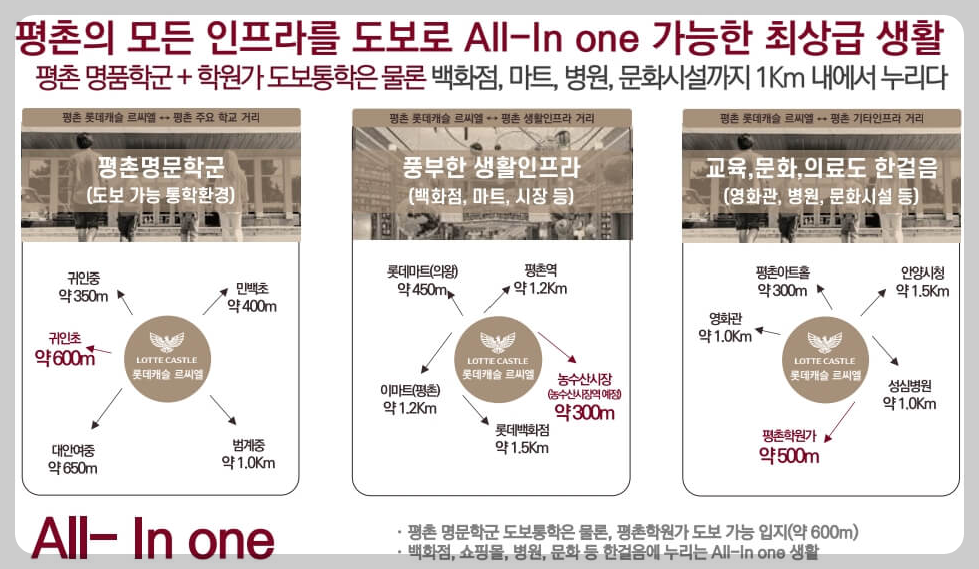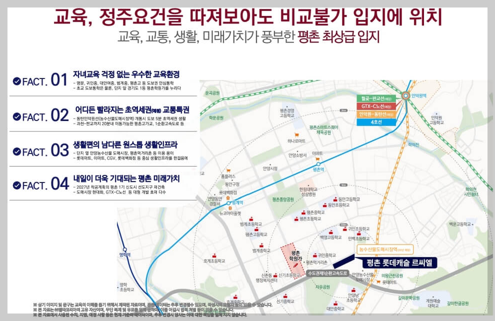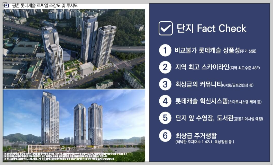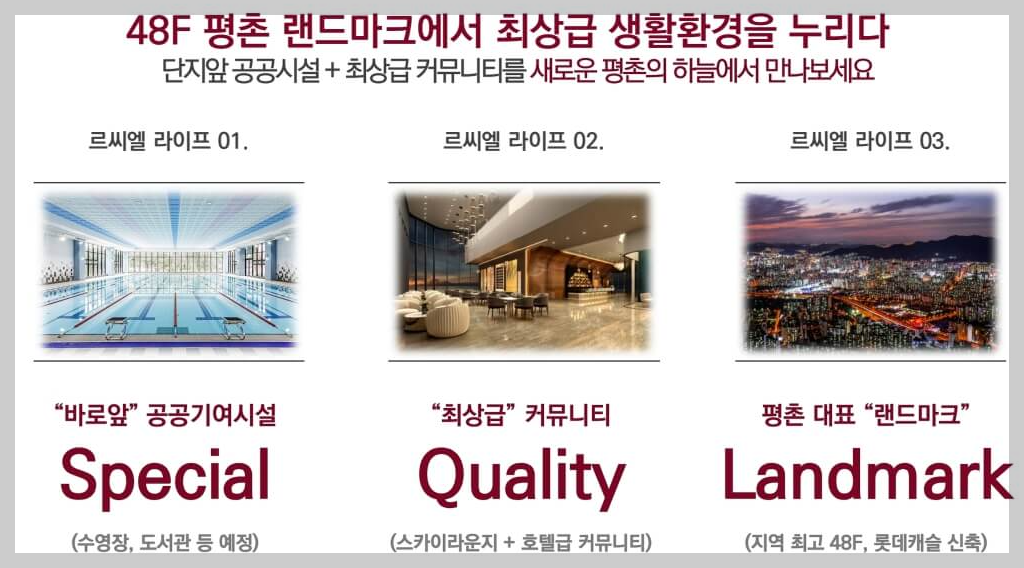 결론적으로, 평촌 롯데캐슬 르엘 오피스텔은 이미 완성된 생활 인프라, 교육 환경, 우수한 교통망에 향후 개발 호재까지 더해져 미래가치가 높게 평가되는 단지입니다. 단지 설계, 평면 구성, 커뮤니티, 조경, 수납공간까지 세심하게 계획되어 실거주 만족도가 높으며, 중대형 면적 중심의 공급 구조로 투자 가치 역시 뛰어납니다.